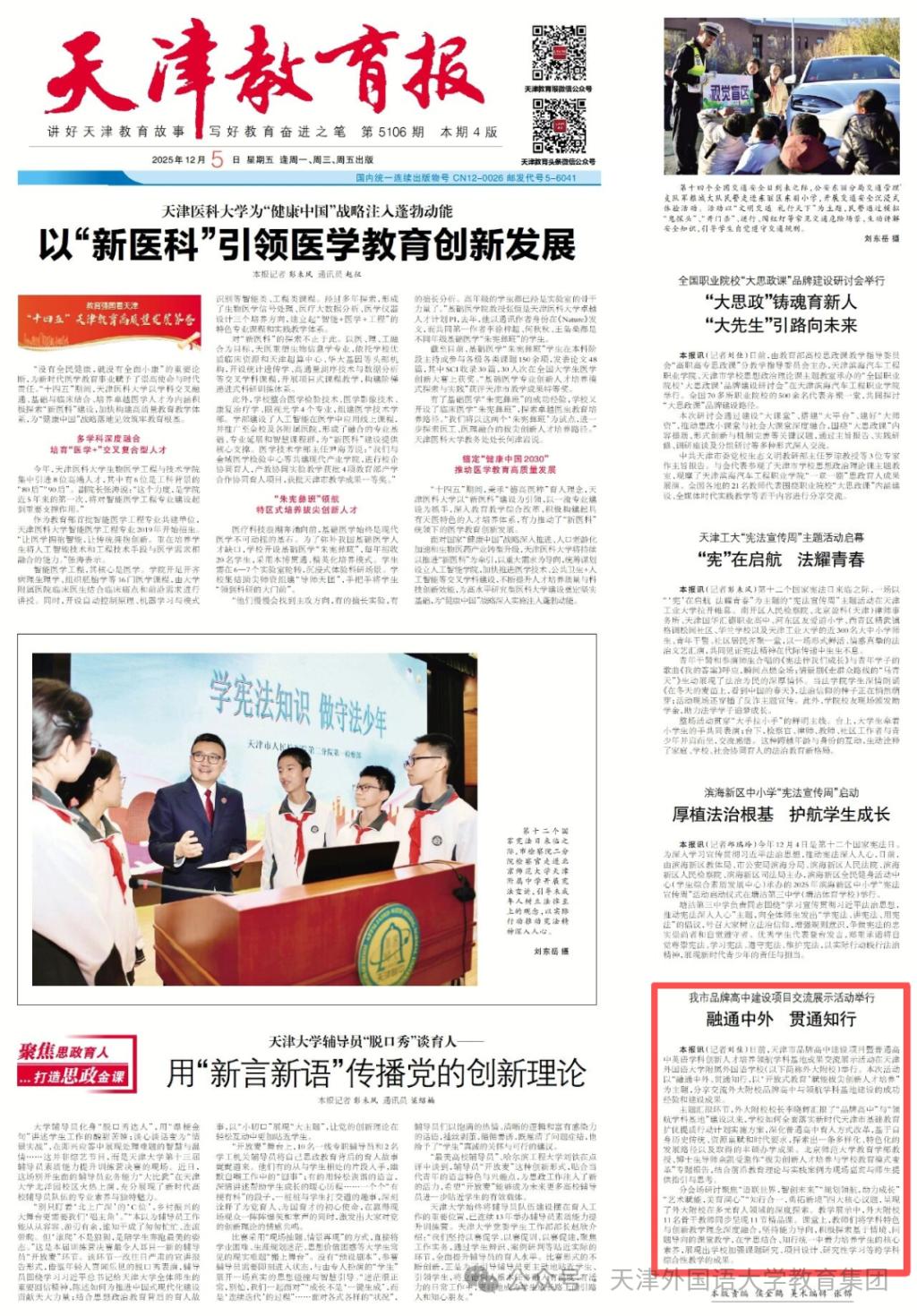 近日,《天津教育报》对市小外市级品牌高中建设项目成果交流展示活动进行了报道。