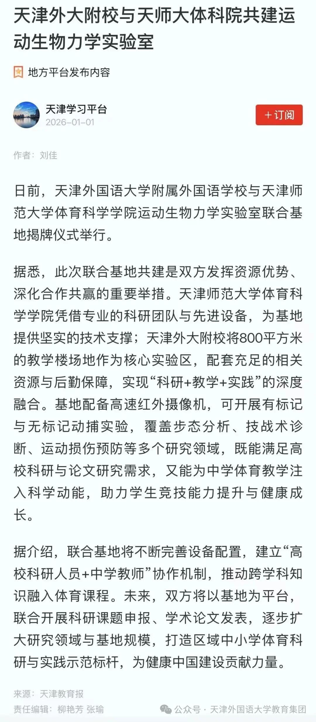 天津学习平台(作者:刘佳)日前,天津外国语大学附属外国语学校与天津师范大学体育科学学院运动生物力学实验室联合基地揭牌仪式举行。